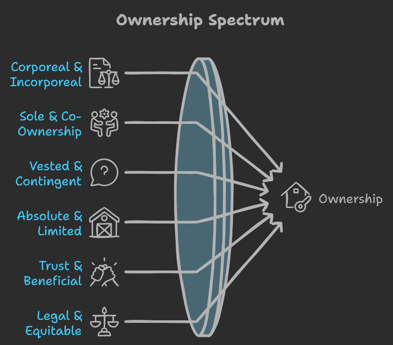 The Ownership may be of a physical object or of a right only it is called as corporeal Ownership. For example: Ownership over land, house, Car etc..